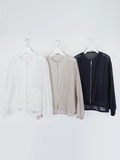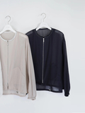 クルーネック部分にサテンをあしらいボールチェーンを施し高級感あるブルゾン。