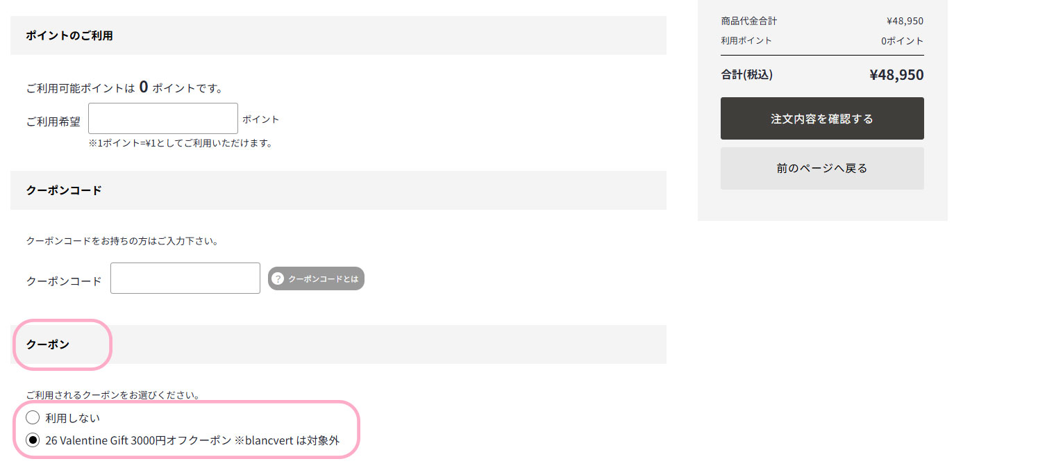 下の方にクーポンを選ぶ箇所がございますのでこちらから選択してご利用ください。